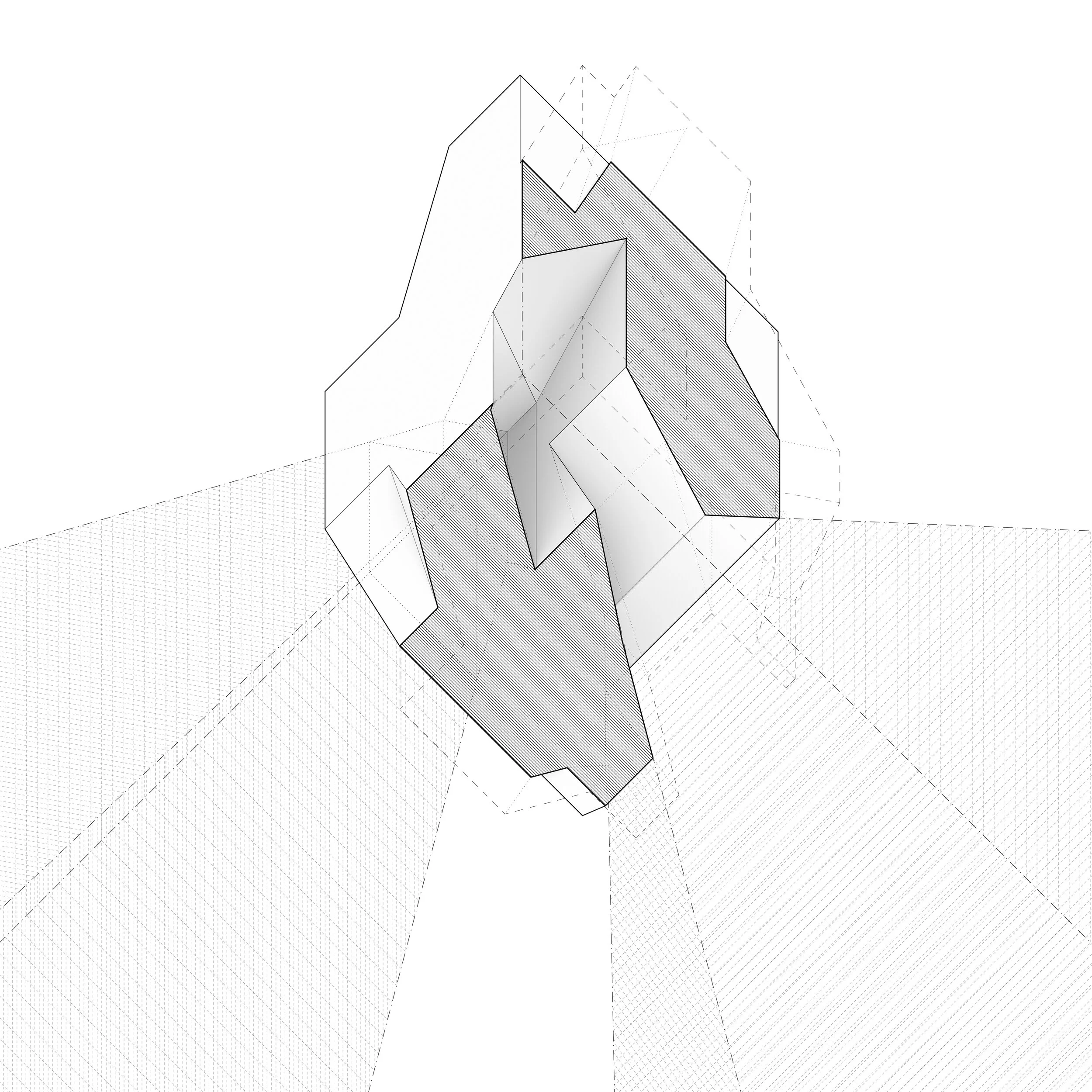 The project combines three different systems of grids that intersect to create misalignment and shifting of the grid. The misalignment generates a large, interior-focused spatial condition that is complemented with smaller, exterior-focused spaces. The Worm’s Eye analysis creates a dense visual effect for the viewer to highlight the complexity created by the three system of grids. The different hatches distinguish the systems, but their similar tones showcase that they connect to create a whole.