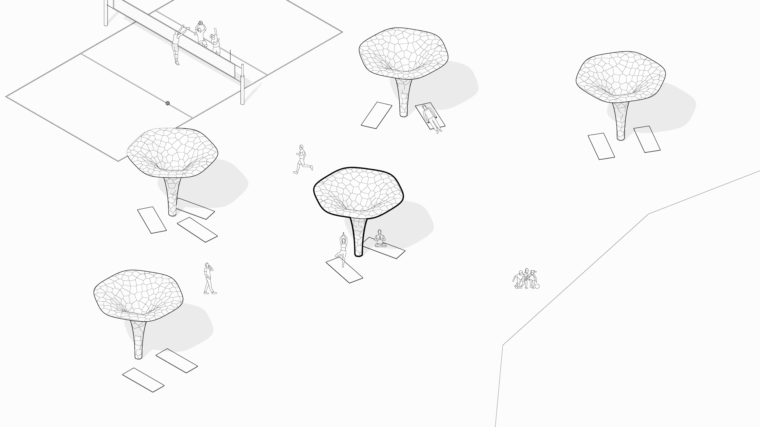 The Komorebi Cell intends to be a flexible tool for designers to produce creative designs that serve as public amenities both in function and in aesthetic. The single canopy unit can be greatly modular, being isolated as a single unit, a small collection, a larger group, or even covering an entire area. This is intended to suit different programs and settings, such as sun shading for the beach, a bus stop, or even a playground canopy in the park.